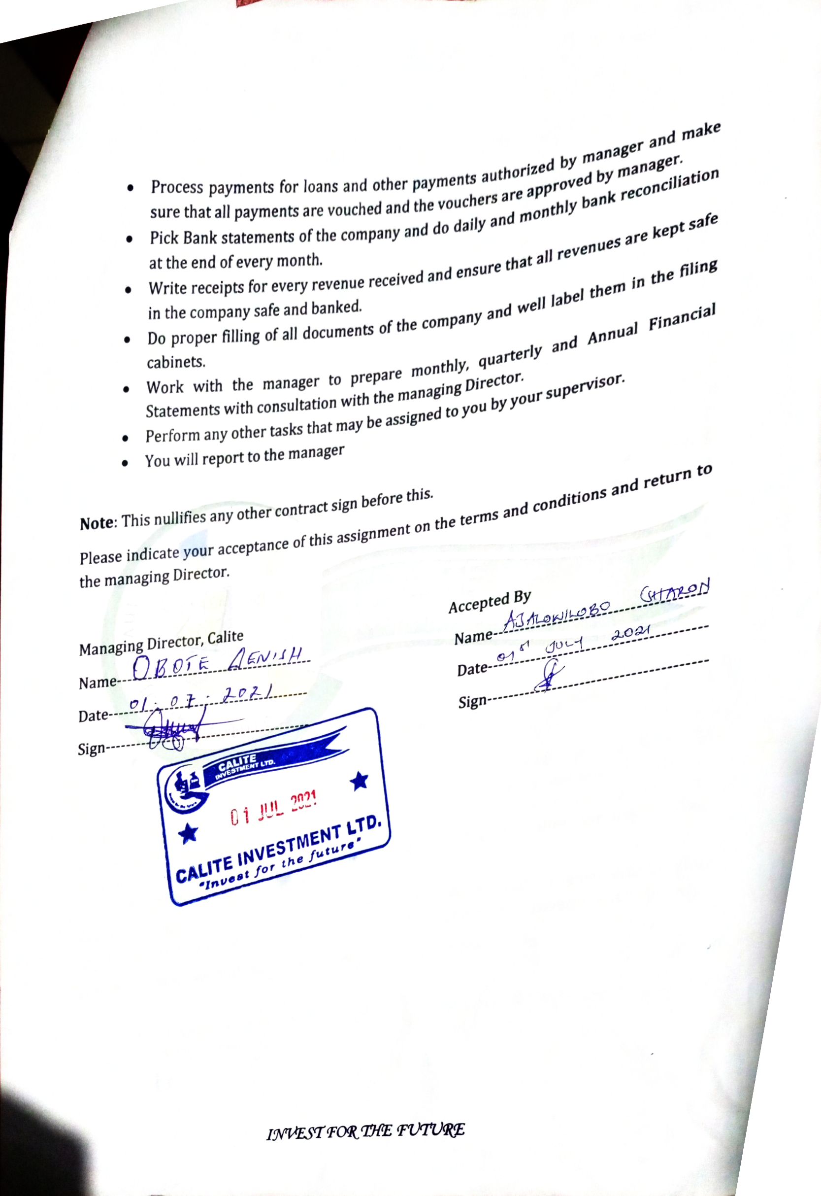 Process payments for loans and other payments authorized by manager. Pick bank statements of the company and do daily and monthly bank reconciliation. Write receipts for every revenue received and ensure that all the revenues are kept safe and banked. Do proper filing of all documents of the company. Work with manager to prepare monthly, quarterly and annual financial statements.